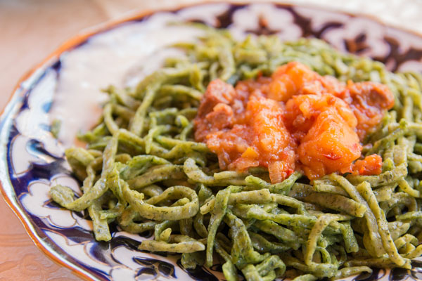 麺に香草のディルが練り込んであり、さっぱりとした味付けです。付け合わせで付いてくるヨーグルトを付けながら食べます。