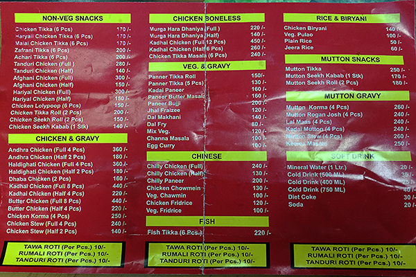 ここはチキンの串焼き(ケバブ)がメインのお店です。値段は一品200ルピー前後で観光客からすると安いと感じますが、現地の物価と比較すると少し高めで地元向けのレストランです。